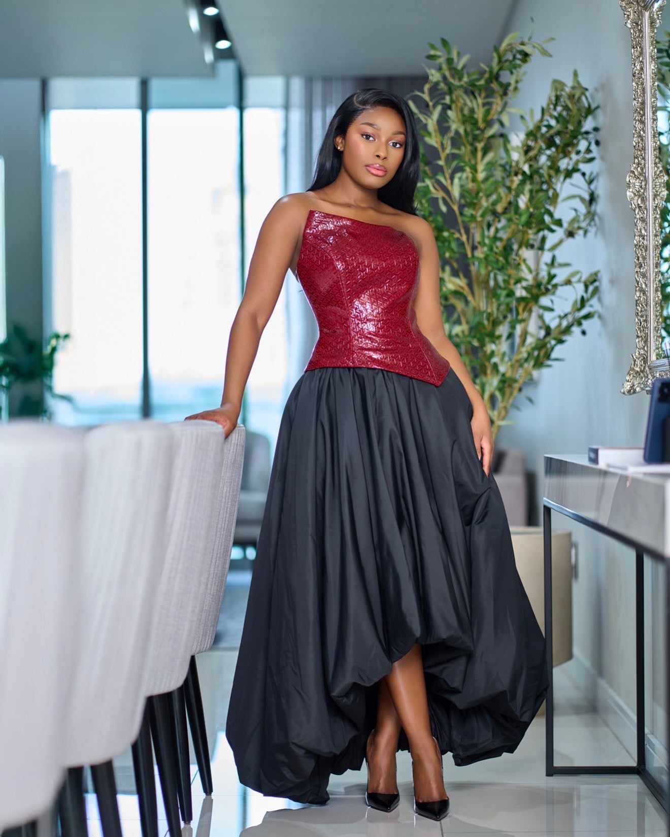 Bubble dress with leather burgundy top
